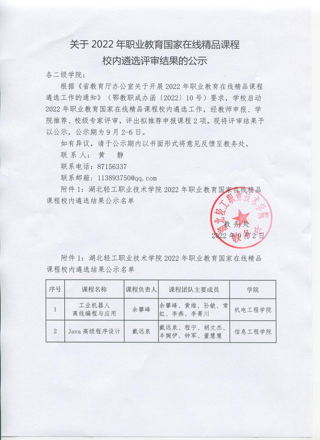关于2022年职业教育国家在线精品课程校内遴选评审结果的公示